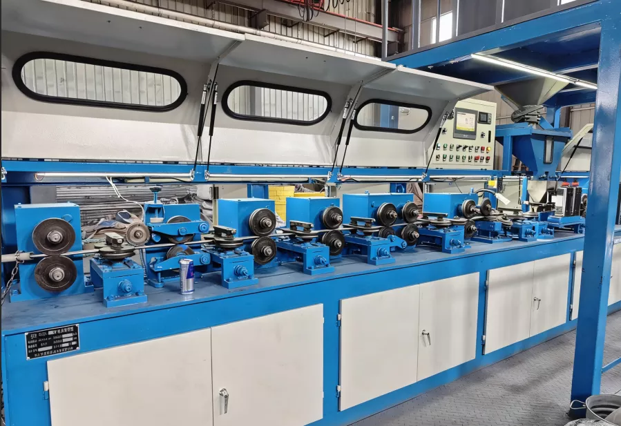 1、生产的包芯线规格:Φ13±0.5mm 2、主机电机:7.5KW电磁调速电机; 3、工作成型速度:30-40 m/min; 4、成型速度调整范围:0-50 m/min; 5、生产量:6-8t/班 6、长度计量方式:数字显示 7、线盘规格:内径Φ600mm×外径Φ1250mm×长度800mm。 特点: 1、采用机电一体化操作。操作方便,轧辊调整简单快捷。 2、复卷排线换向方式为手动档杆换向